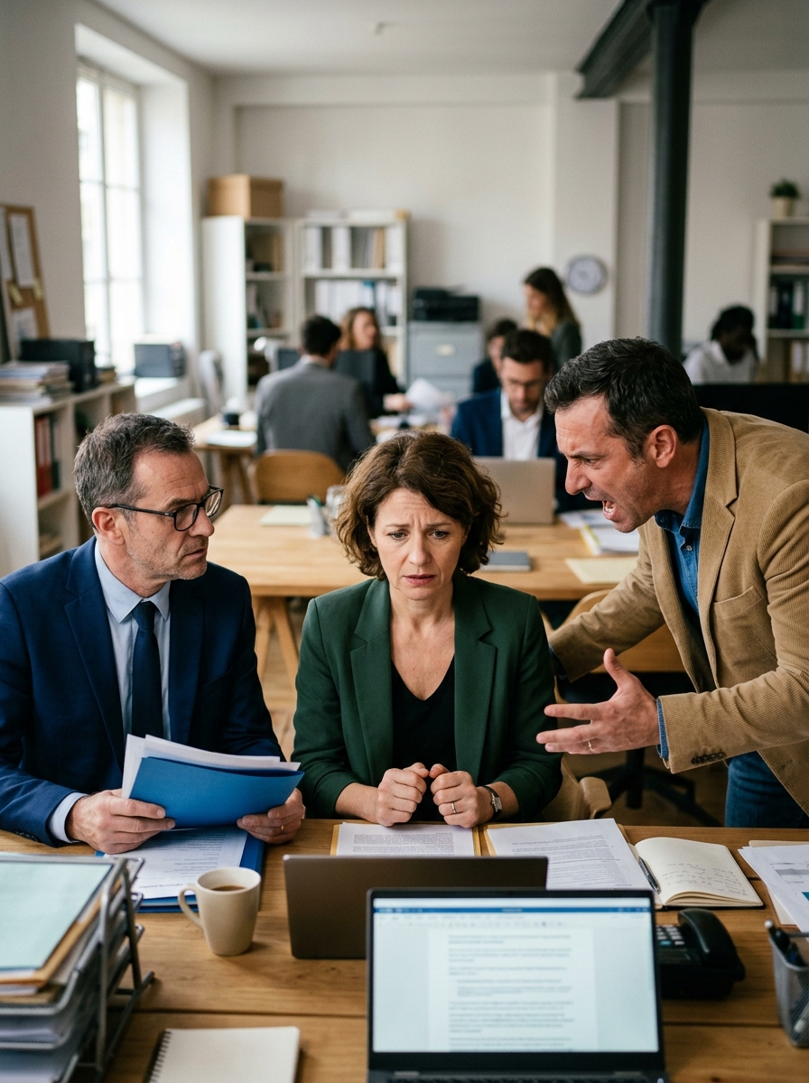 Le lendemain, dans la salle de réunion du cabinet juridique, Antoine affichait une assurance impeccable. Costume parfaitement ajusté, dossier soigneusement ordonné devant lui. Sophie, elle, portait une robe simple et tenait un petit sac à main.
